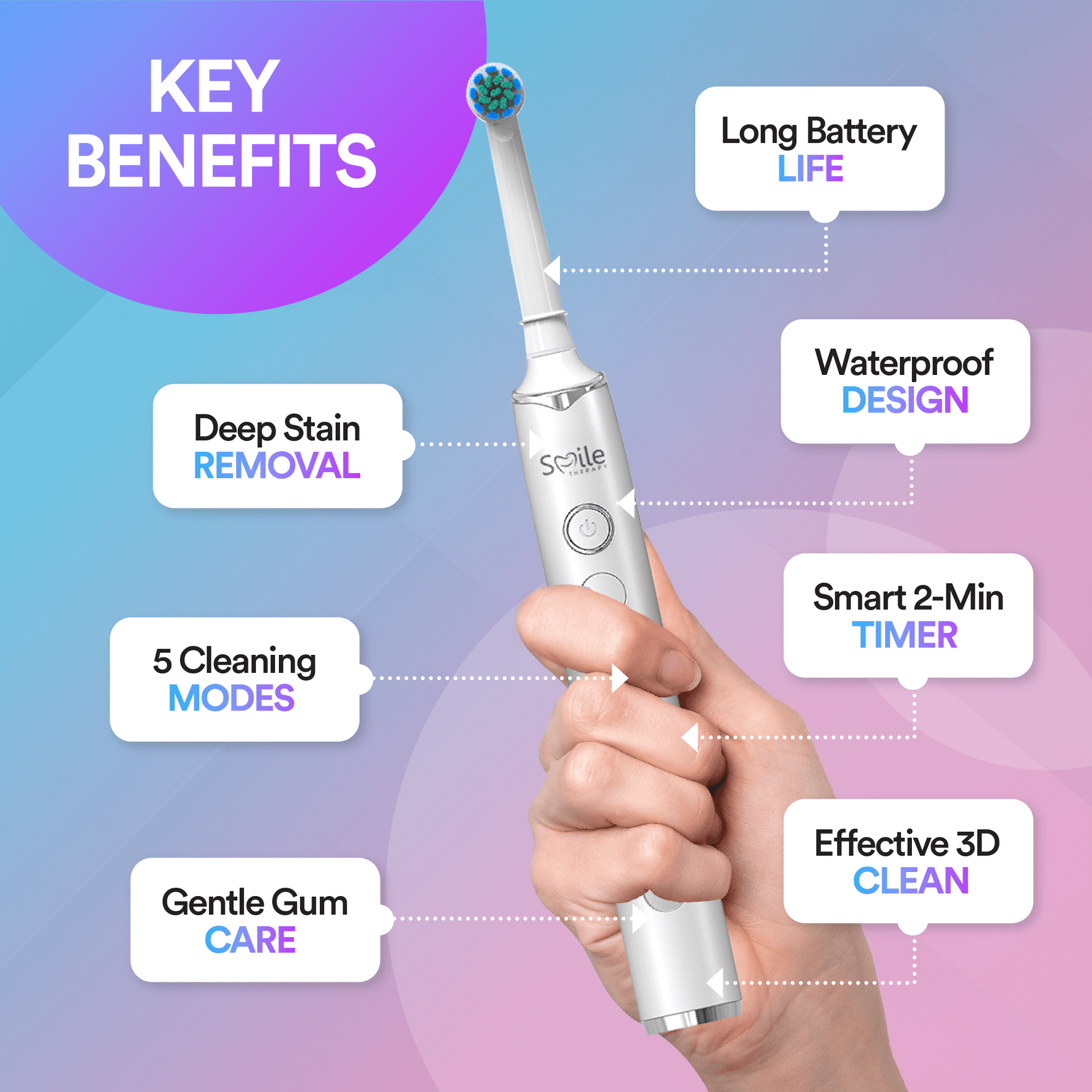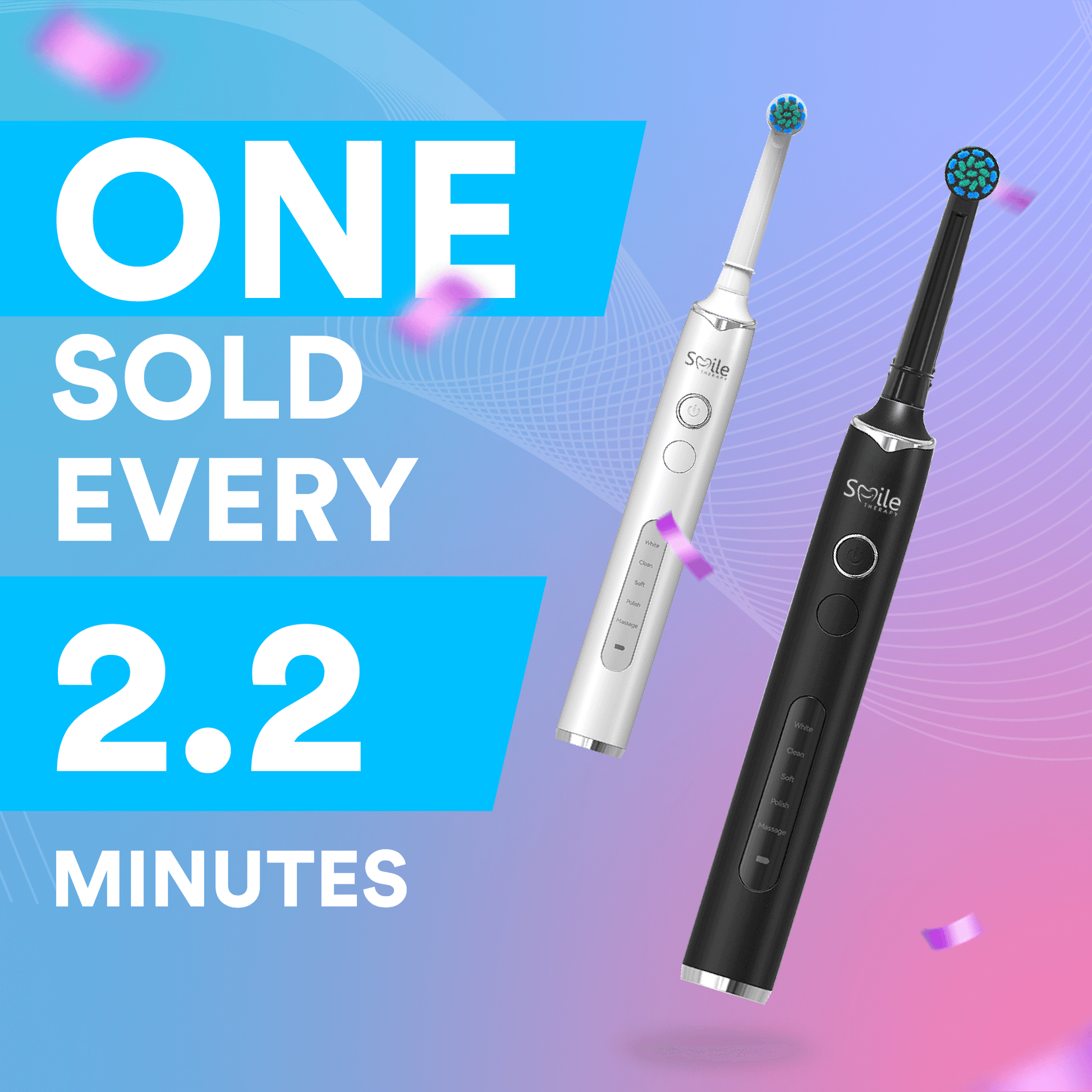 Our Oscillating 5-in-1 Electric Toothbrush uses advanced 3D cleaning technology to deliver a deep, precise clean with the comfort of a gentle brush. With five tailored brushing modes and high-speed rotations, it lifts stains, protects gums, and transforms your daily routine into a soothing self-care ritual.