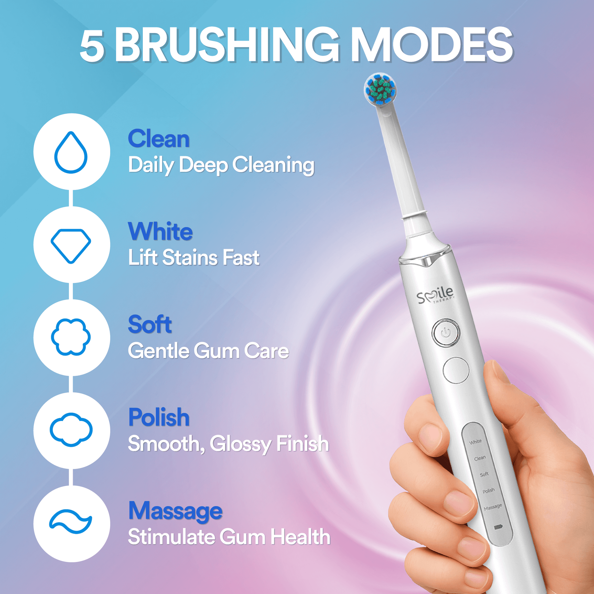 ✓ Five modes: Clean, White, Soft, Polish, Massage.